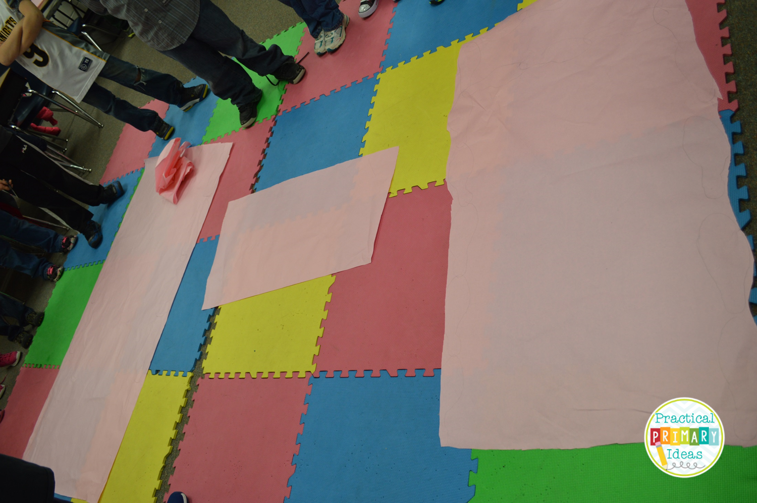 The following day, I had them create a bed for Queen Collins. Just as in the story, I had them measure me a bed, using butcher paper. They worked in groups with very minimal instructions.