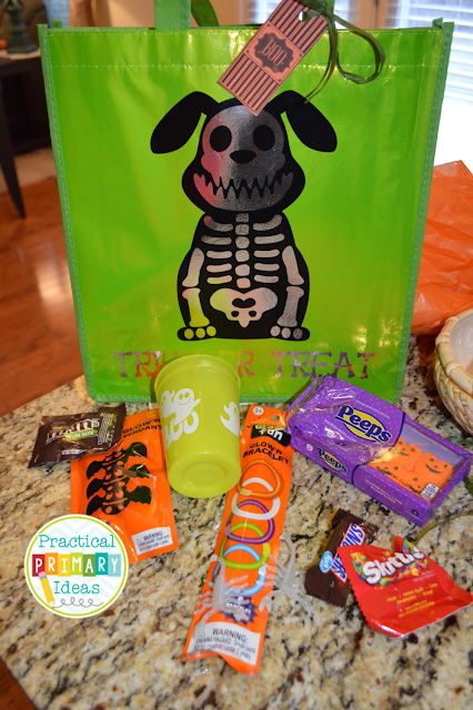 Halloween bag, glow jewelry, glow-in-the-dark insects, cup, AND candy.